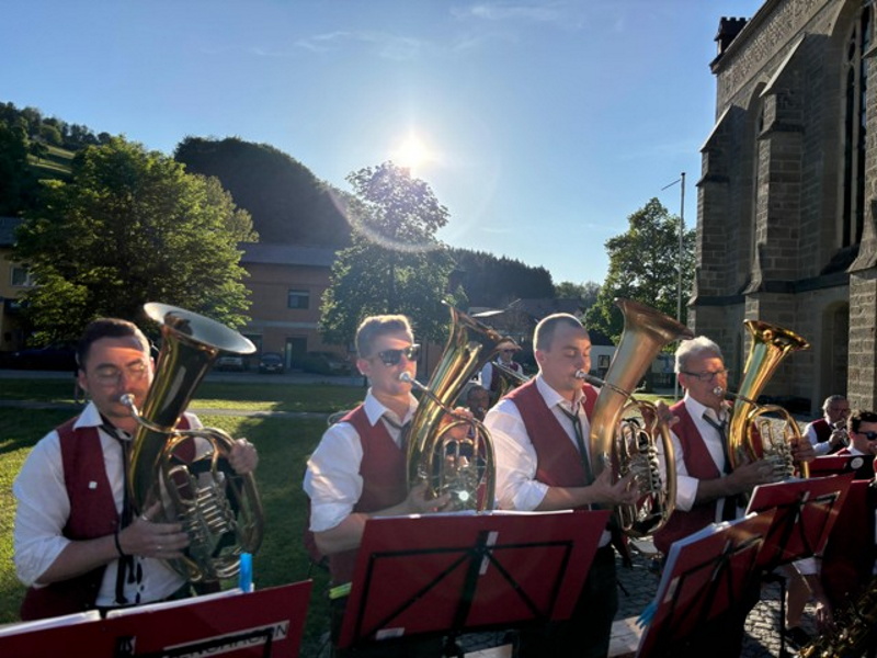 In occasione del pellegrinaggio a Roma, la Trachtenmusikkapelle Kleinraming invita a un concerto all’aperto davanti a Santa Maria in Trastevere. In programma composizioni musicali provenienti dall’Austria. Le Marketenderinnen (vivandiere) invitano a degustare i loro distillati ad alta gradazione.
